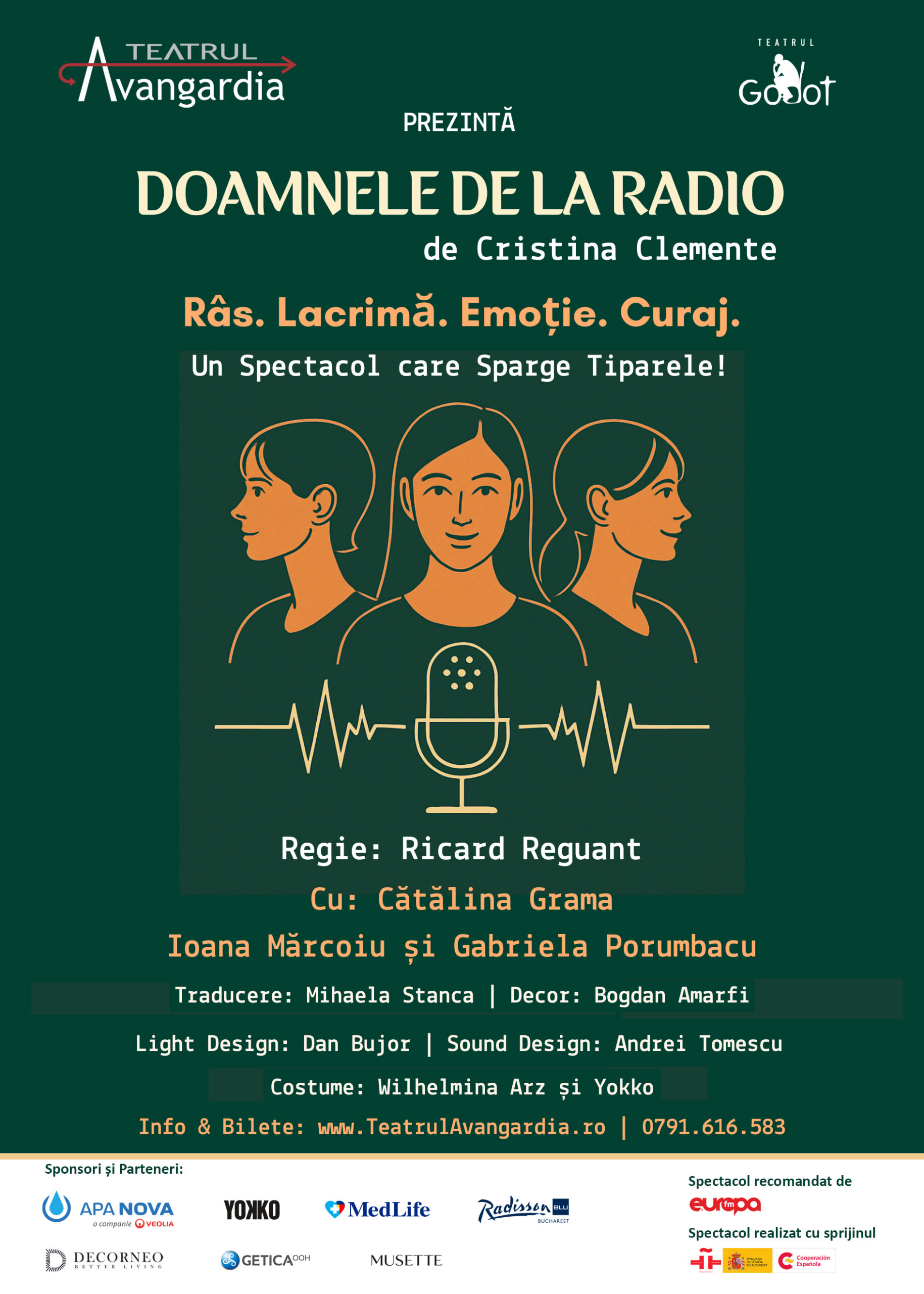 Două repere ale teatrului independent din România, Teatrul Avangardia şi Teatrul Godot, îşi dau mâna pentru prima lor colaborare: premiera naţională a spectacolului Doamnele de la Radio de Cristina Clemente. Spectatorii vor lua parte la o întâlnire explozivă unde vulnerabilitatea, umorul şi emoţiile brute dau naştere unui spectacol intens şi profund uman. Primele reprezentaţii au loc în 24 şi 26 octombrie 2025, la Palatul Bragadiru – Sala Godot.