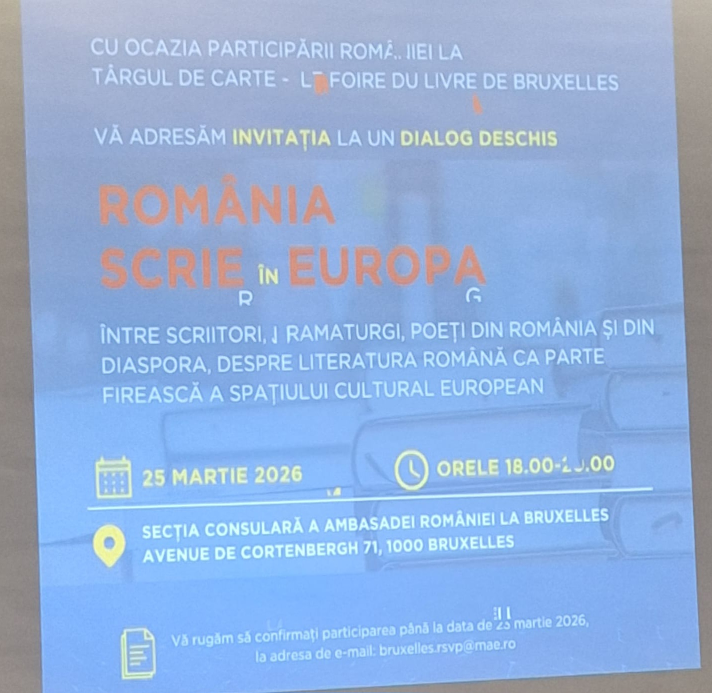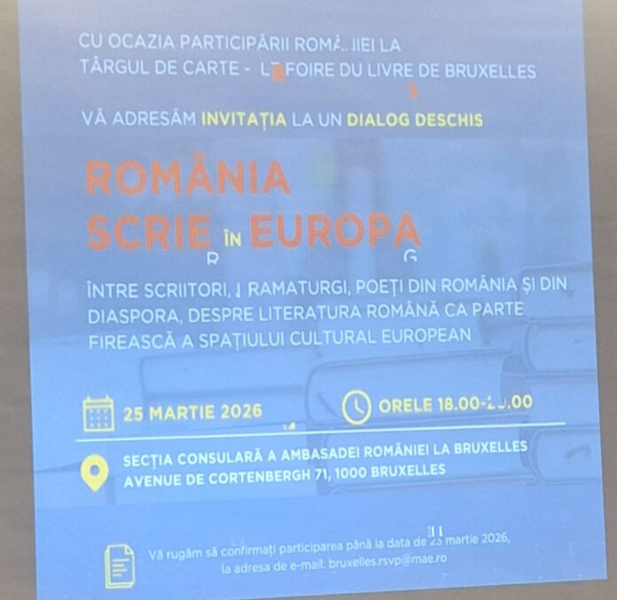 Întâlnirea cu dramaturgii a avut loc în cadrul evenimentului cultural „România scrie în Europa”, organizat la Consulatul României de la Bruxelles, în prezenţa Excelenţei Sale, doamna ambasador Andreea Păstârnac, şi la care a participat şi doamna comisar european Roxana Mînzatu, vicepreşedintele executiv al Comisiei Europene, dar şi un public numeros, de toate vârstele, predominând însă tinerii educaţi şi inteligenţi, veniţi din România pentru a vizita Parlamentul European.